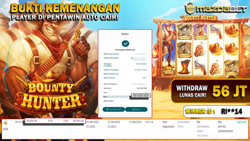 BUKTI KEMENANGAN DAN WITHDRAW 01 Oktober 2025 Di Game Bounty Hunter WD 56 JUTA
