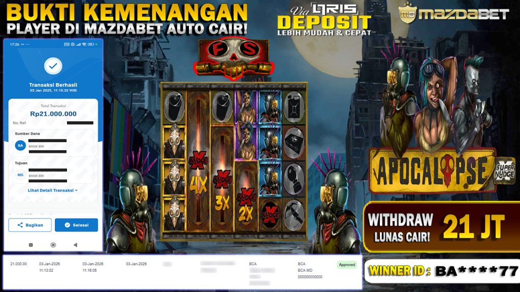 BUKTI KEMENANGAN DAN WITHDRAW 03 JANUARI 2026 Di Game Apocalypse Super xNudge WD 21 JUTA
