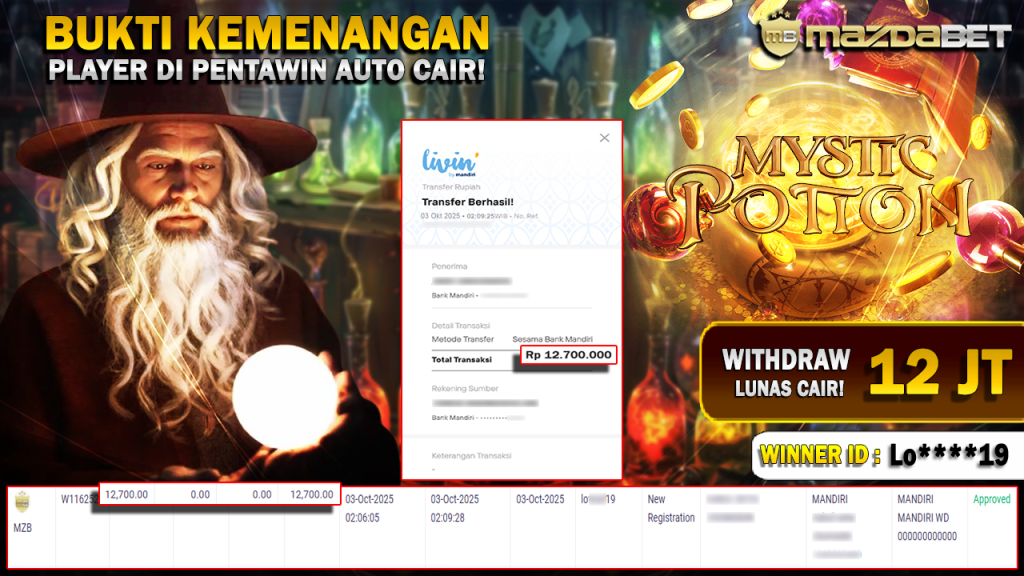 BUKTI KEMENANGAN DAN WITHDRAW 03 Oktober 2025 Di Game Mystic Potion WD 12 JUTA