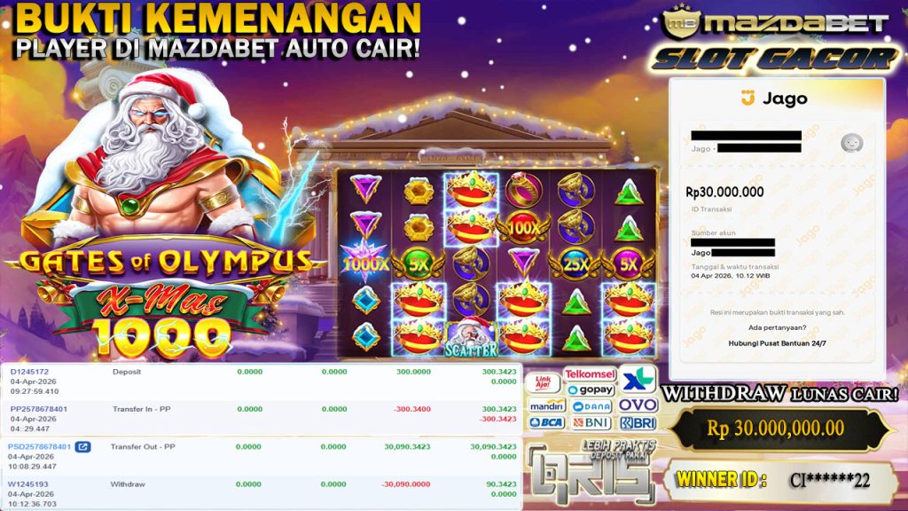BUKTI KEMENANGAN DAN WITHDRAW 04 APRIL 2026 Di Game Gates of Olympus Xmas 1000 ( Pragmatic Play ) WD 30 JUTA