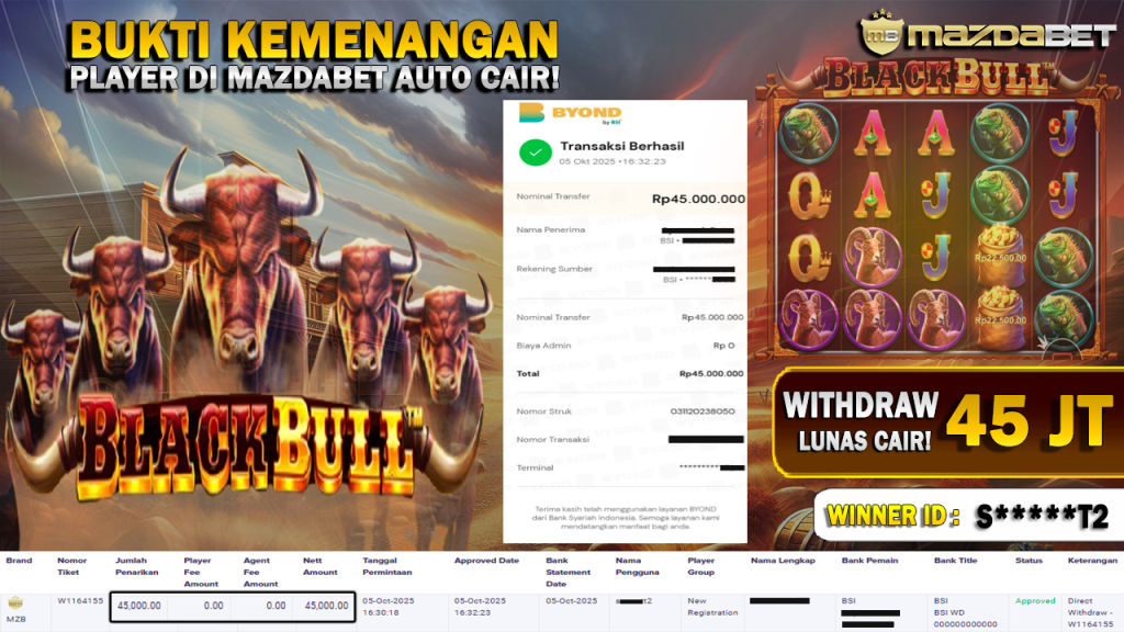 BUKTI KEMENANGAN DAN WITHDRAW 05 Oktober 2025 Di Game Black Bull ( Pragmatic Play ) WD 45 JUTA