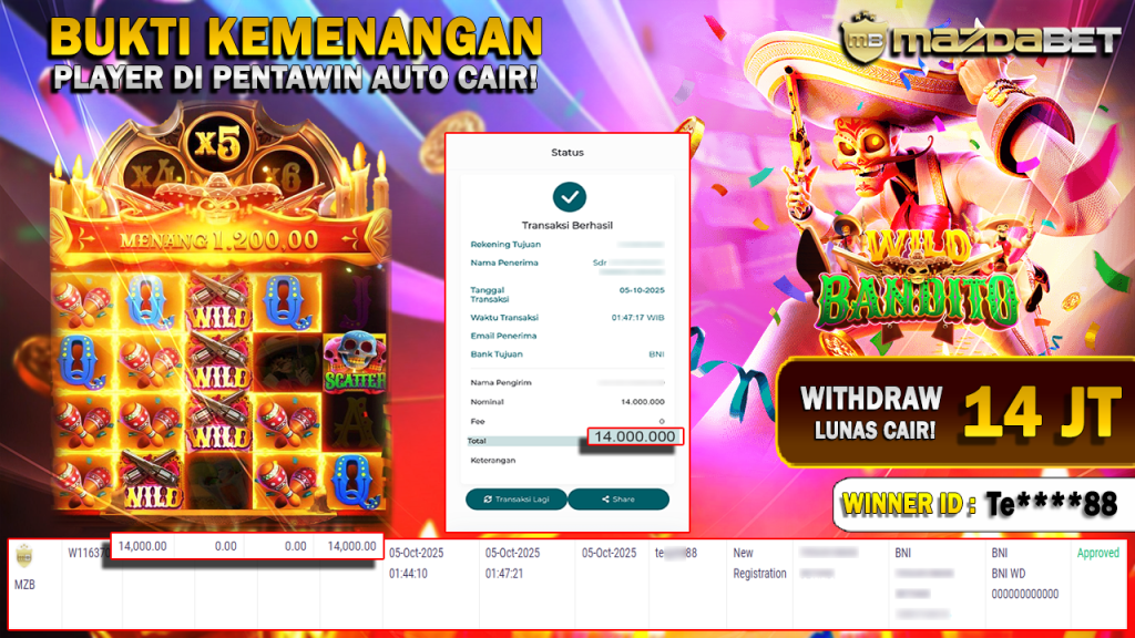 BUKTI KEMENANGAN DAN WITHDRAW 05 Oktober 2025 Di Game Wild Bandito WD 14 JUTA