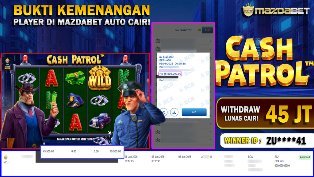 BUKTI KEMENANGAN DAN WITHDRAW 06 JANUARI 2026 Di Game Cash Patrol WD 45 JUTA