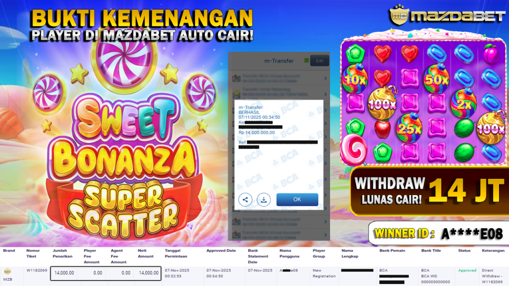 BUKTI KEMENANGAN DAN WITHDRAW 07 November 2025 Di Game Sweet Bonanza Super Scatter Wd 14 JUTA