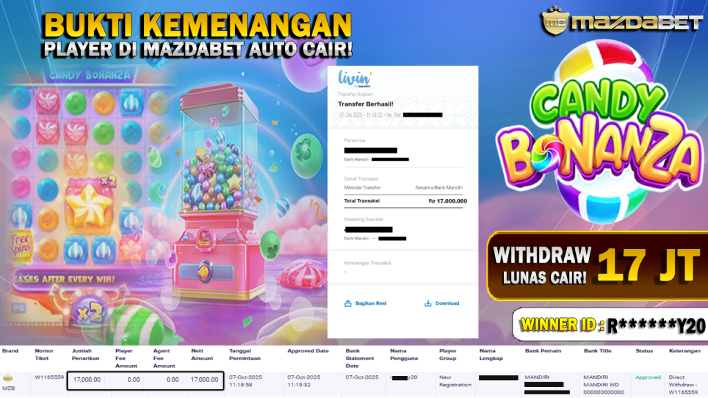 BUKTI KEMENANGAN DAN WITHDRAW 07 Oktober 2025 Di Game Candy Bonanza PG SOFT WD 17 JUTA