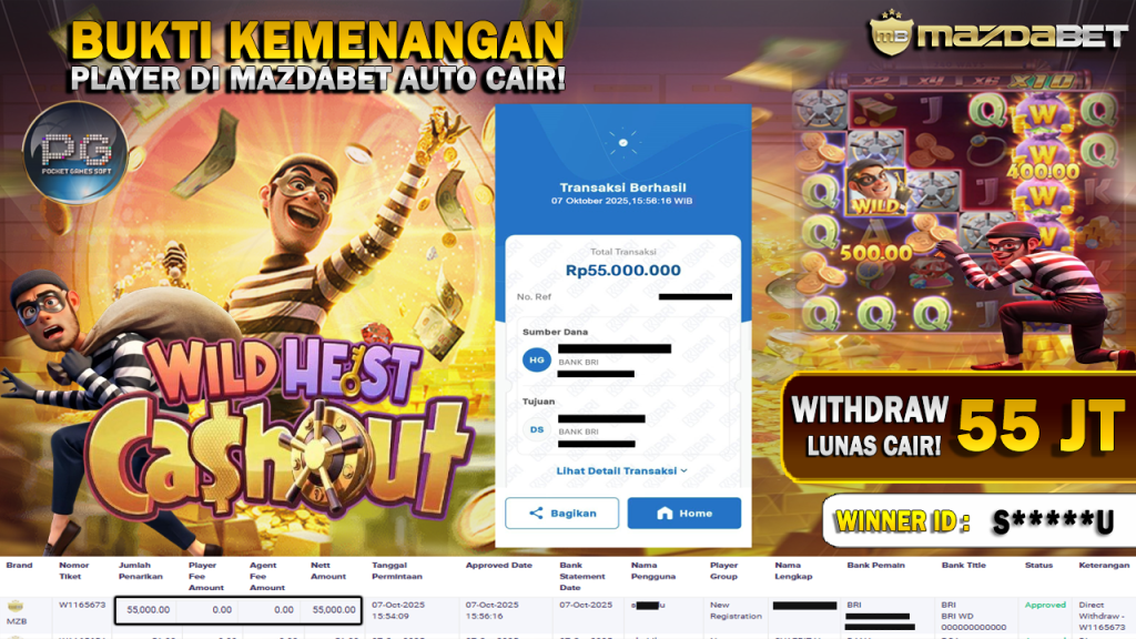 BUKTI KEMENANGAN DAN WITHDRAW 07 Oktober 2025 Di Game Wild Heist Cashout WD 55 JUTA