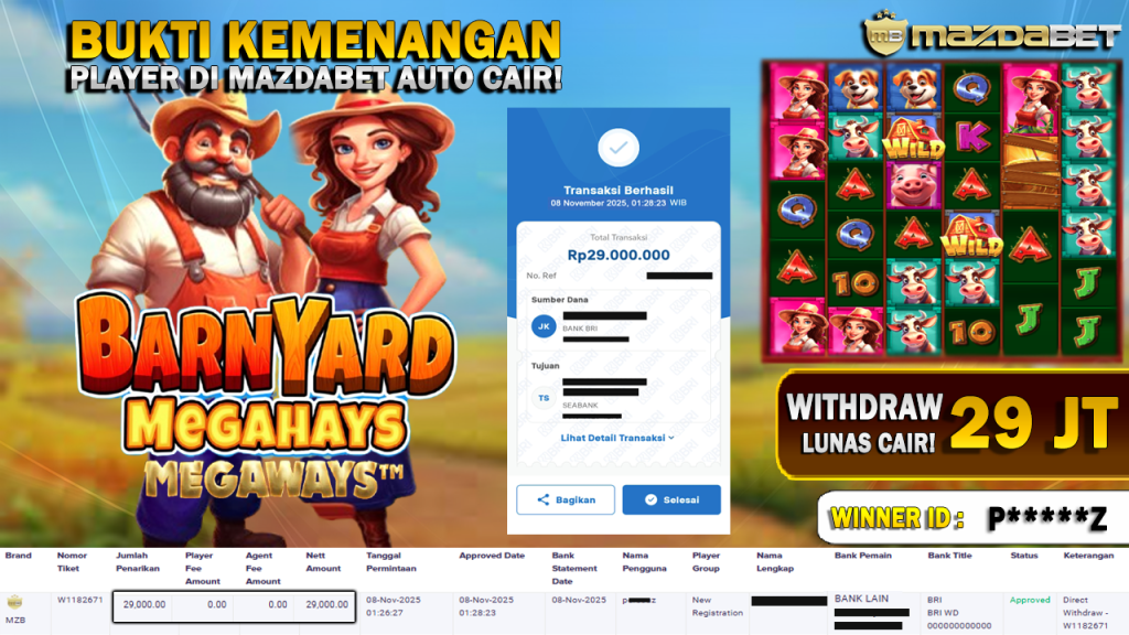 BUKTI KEMENANGAN DAN WITHDRAW 08 November 2025 Di Game Barnyard Megahays Megaways Wd 29 JUTA