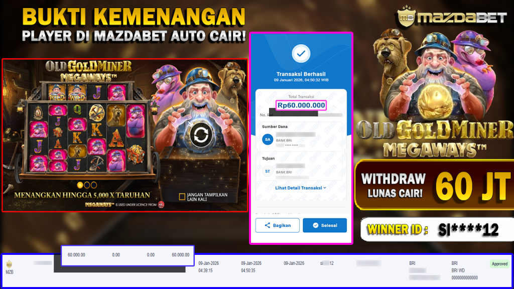 BUKTI KEMENANGAN DAN WITHDRAW 09 JANUARI 2026 Di Game Old Gold Miner Megaways WD 60 JUTA