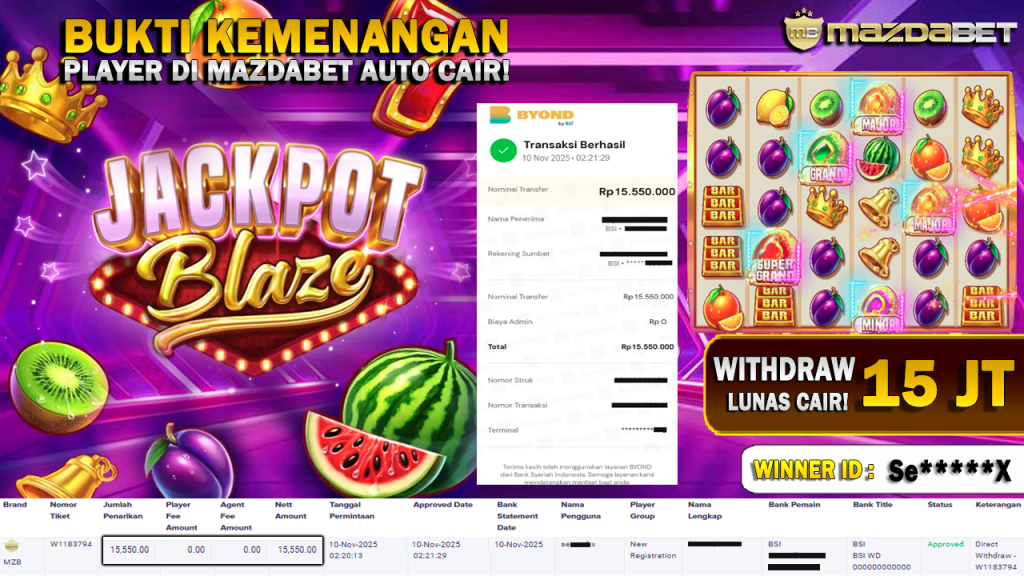 BUKTI KEMENANGAN DAN WITHDRAW 10 November 2025 Di Game Jackpot Blaze WD 15 JUTA