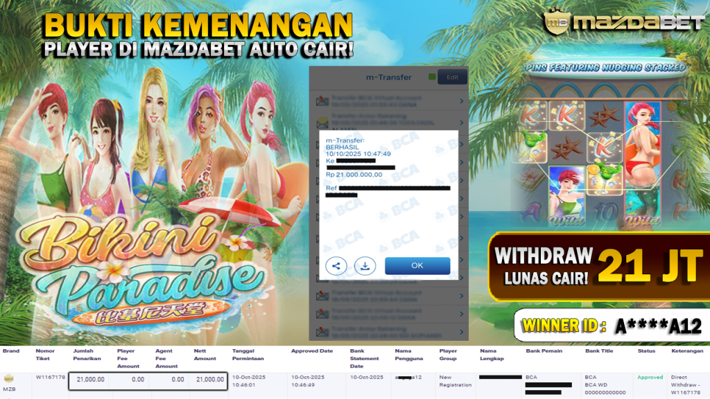 BUKTI KEMENANGAN DAN WITHDRAW 10 Oktober 2025 Di Game Bikini Paradise WD 21 JUTA