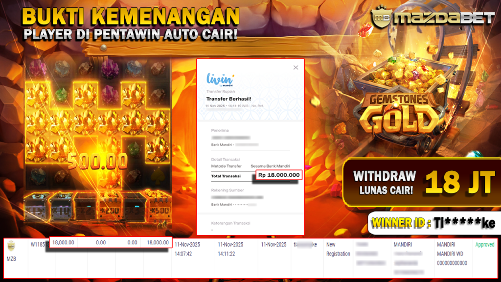 BUKTI KEMENANGAN DAN WITHDRAW 11 November 2025 Di Game Gemstones Gold WD 18 JUTA