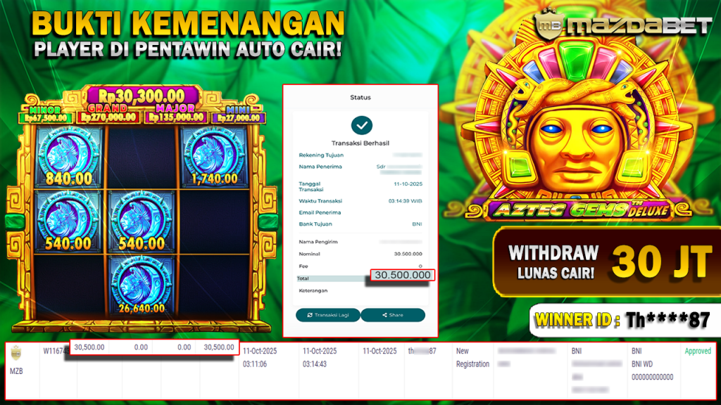 BUKTI KEMENANGAN DAN WITHDRAW 11 Oktober 2025 Di Game Aztec Gems Deluxe WD 30 JUTA