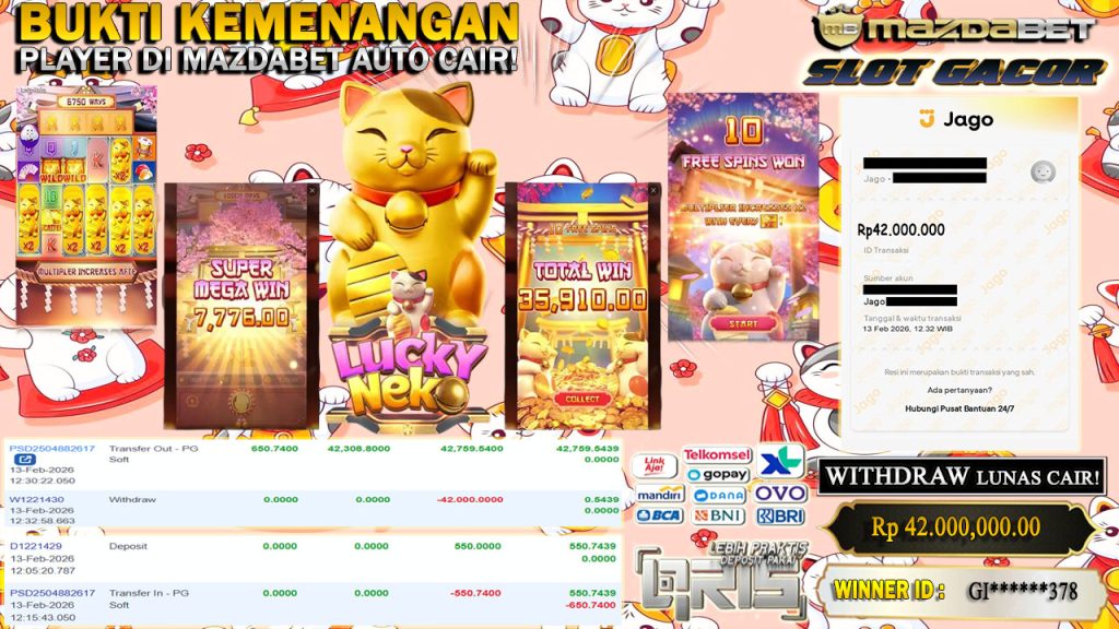 BUKTI KEMENANGAN DAN WITHDRAW 13 FEBRUARI 2026 Di GAME Lucky Neko WD 42 JUTA