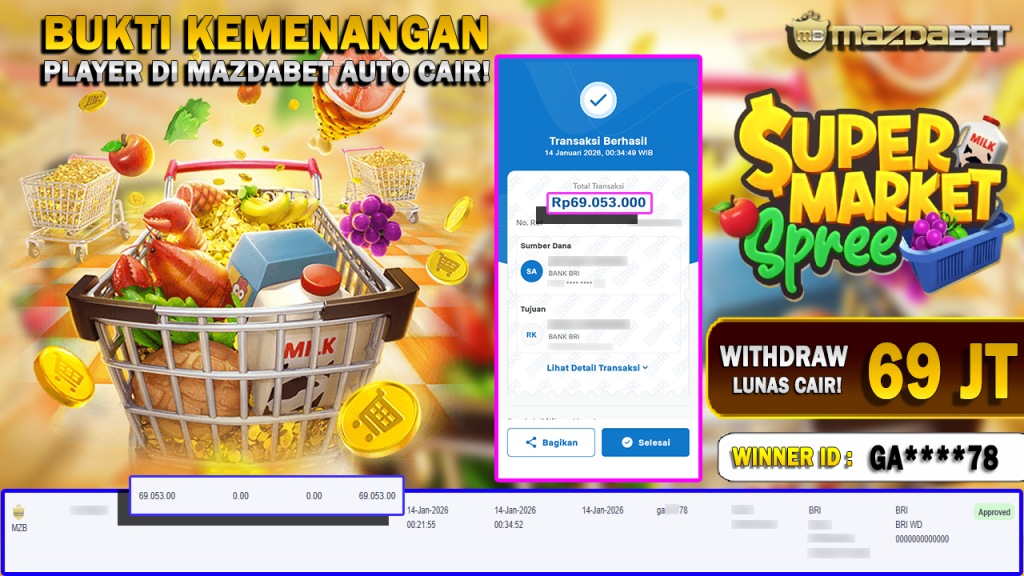 BUKTI KEMENANGAN DAN WITHDRAW 14 JANUARI 2026 Di Game supermarket spree WD 69 JUTA