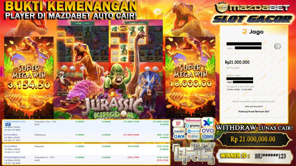 BUKTI KEMENANGAN DAN WITHDRAW 14 MARET 2026 Di Game Jurassic Kingdom ( PG SOFT ) WD 21 JUTA