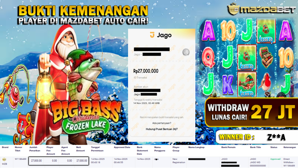 BUKTI KEMENANGAN DAN WITHDRAW 14 November 2025 Di Game Big Bass Christmas – Frozen Lake WD 27 JUTA