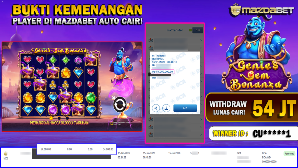 BUKTI KEMENANGAN DAN WITHDRAW 15 JANUARI 2026 Di Game Genie’s Gem Bonanza WD 54 JUTA