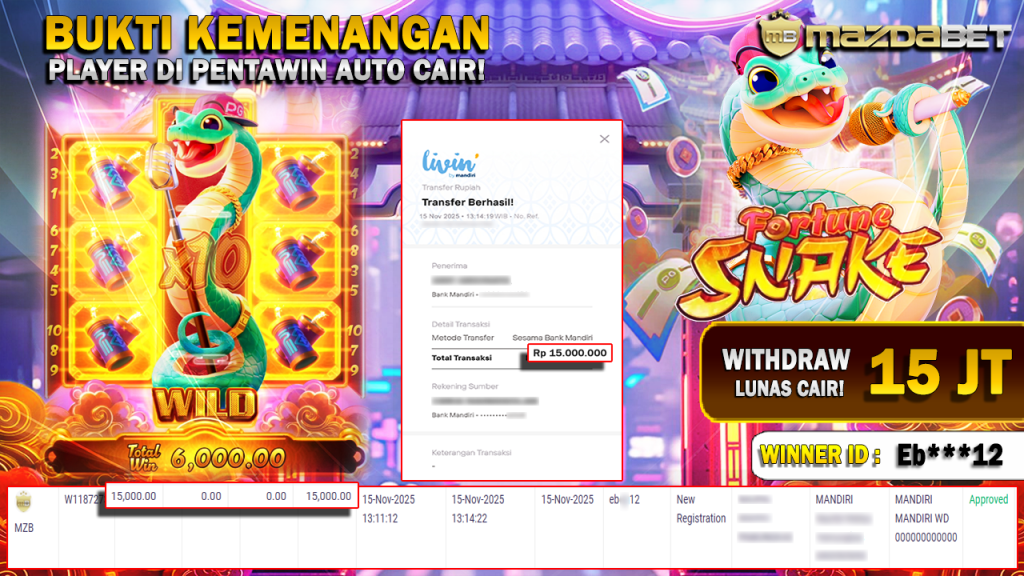 BUKTI KEMENANGAN DAN WITHDRAW 15 November 2025 Di Game Fortune Snake WD 15 JUTA