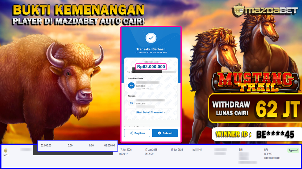 BUKTI KEMENANGAN DAN WITHDRAW 17 JANUARI 2026 Di Game Mustang Trail WD 62 JUTA