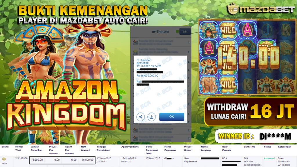 BUKTI KEMENANGAN DAN WITHDRAW 17 November 2025 Di Game Amazon Kingdom WD 16 JUTA
