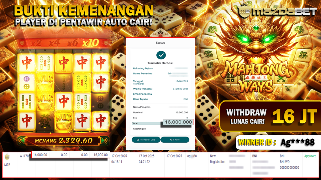 BUKTI KEMENANGAN DAN WITHDRAW 17 Oktober 2025 Di Game Mahjong Ways Wd 16 JUTA