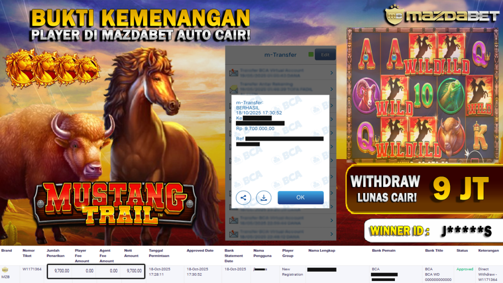 BUKTI KEMENANGAN DAN WITHDRAW 18 Oktober 2025 Di Game Mustang Trail Wd 9 JUTA
