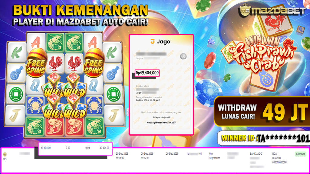BUKTI KEMENANGAN DAN WITHDRAW 20 DESEMBER 2025 Di Game Win Win Fish Prawn Crab WD 49 JUTA