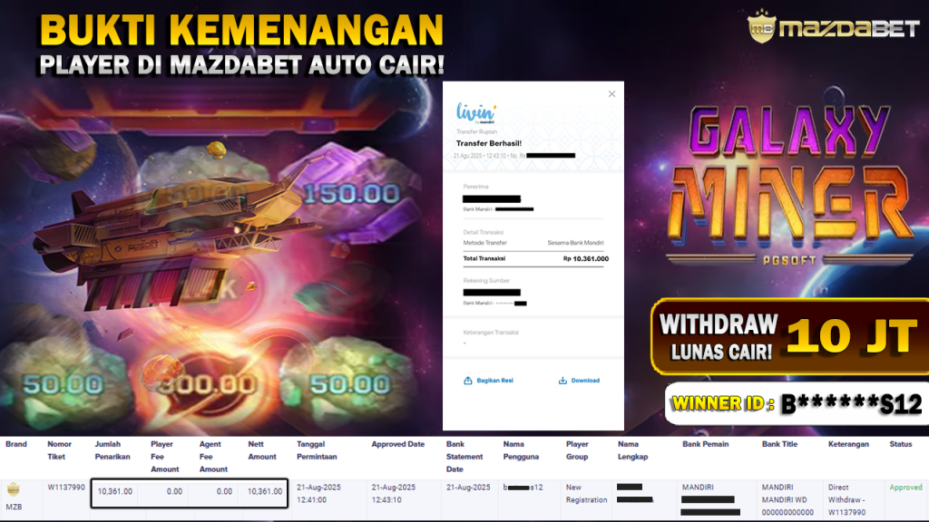 Bukti Kemenangan Dan Withdraw 21 AGUSTUS 2025 Di Game Galaxy Miner WD 10 JUTA