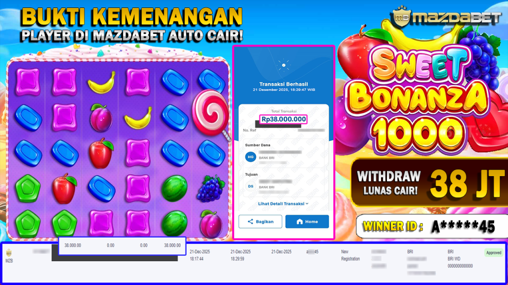 BUKTI KEMENANGAN DAN WITHDRAW 21 DESEMBER 2025 Di Game Sweet Bonanza 1000 WD 38 JUTA