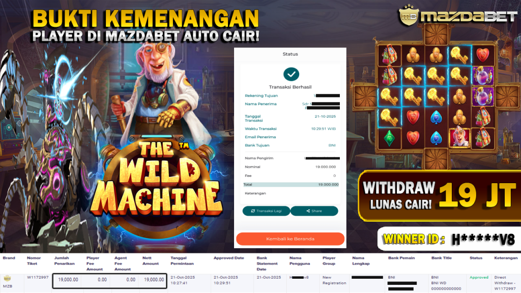BUKTI KEMENANGAN DAN WITHDRAW 21 Oktober 2025 Di Game The Wild Machine Wd 19 JUTA