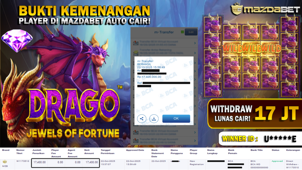 BUKTI KEMENANGAN DAN WITHDRAW 22 Oktober 2025 Di Game Drago – Jewels of Fortune Wd 17 JUTA