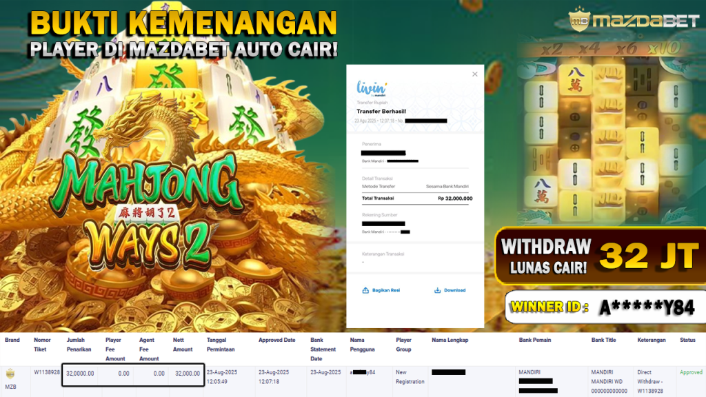 Bukti Kemenangan Dan Withdraw 23 AGUSTUS 2025 Di Game Mahjong Ways 2 WD 32 JUTA
