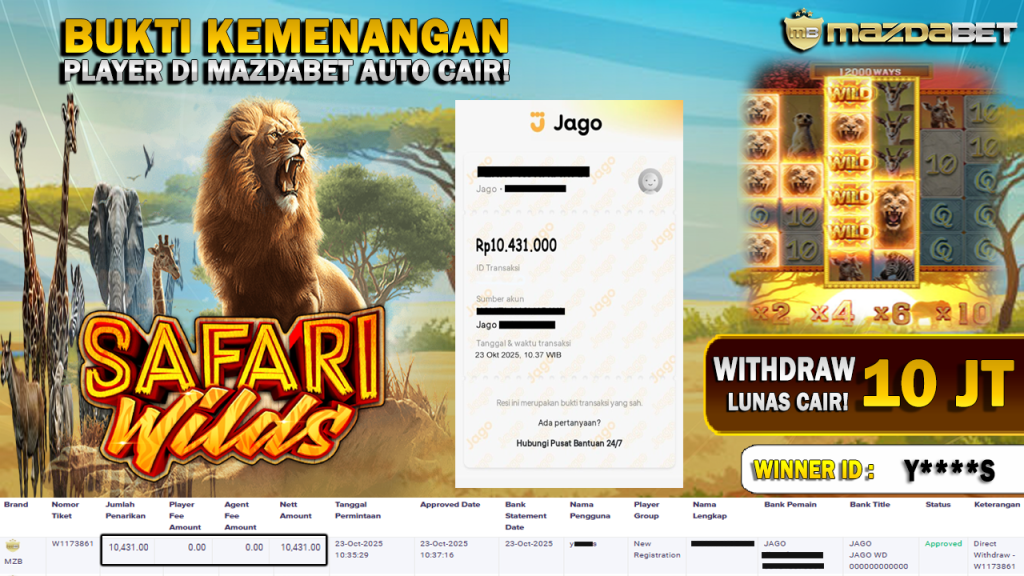 BUKTI KEMENANGAN DAN WITHDRAW 23 Oktober 2025 Di Game Safari Wilds Wd 10 JUTA