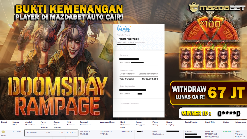 BUKTI KEMENANGAN DAN WITHDRAW 24 Oktober 2025 Di Game Doomsday Rampage Wd 67 JUTA