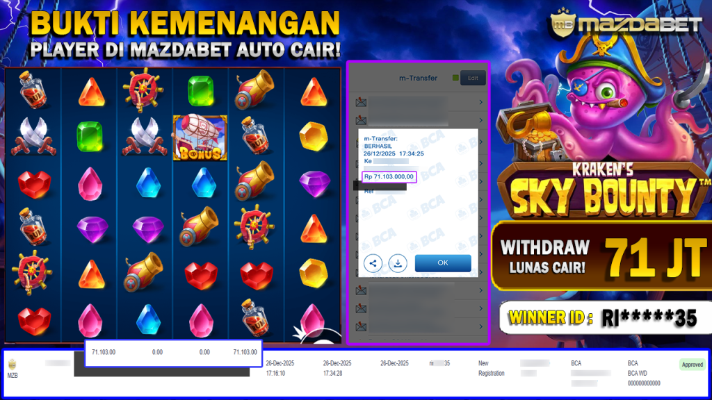 BUKTI KEMENANGAN DAN WITHDRAW 26 DESEMBER 2025 Di Game Sky Bounty WD 71 JUTA