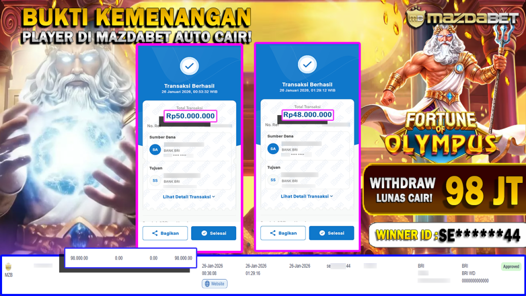 BUKTI KEMENANGAN DAN WITHDRAW 26 JANUARI 2026 Di Game Fortune of Olympus WD 98 JUTA