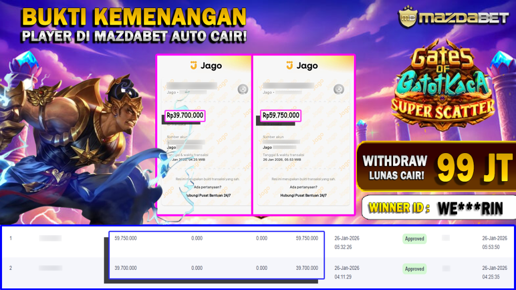 BUKTI KEMENANGAN DAN WITHDRAW 26 JANUARI 2026 Di Game gates of gatot kaca super scatter WD 99 JUTA