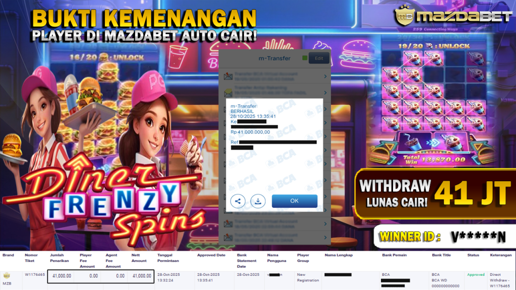 BUKTI KEMENANGAN DAN WITHDRAW 28 Oktober 2025 Di Game Diner Frenzy Spins Wd 41 JUTA