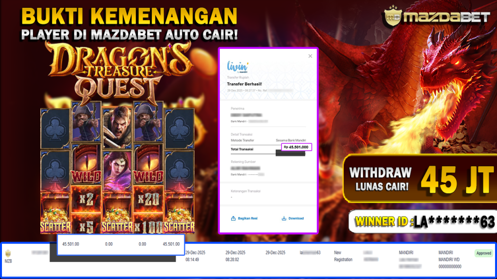 BUKTI KEMENANGAN DAN WITHDRAW 29 DESEMBER 2025 Di Game Dragon’s Treasure Quest WD 45 JUTA