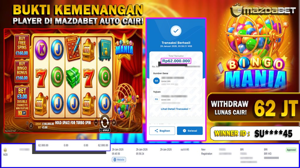 BUKTI KEMENANGAN DAN WITHDRAW 29 JANUARI 2026 Di Game Bingo Mania WD 62 JUTA