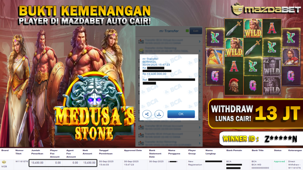 BUKTI KEMENANGAN DAN WITHDRAW 30 SEPTEMBER 2025 DI GAME Medusa’s Stone WD 13 JUTA